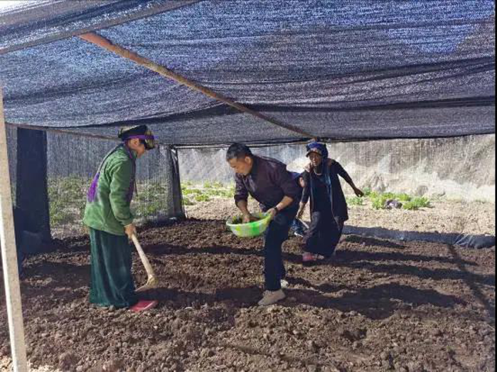 在大石凼村的种植试验大棚里,我和石高让木初、俄玛头等村民一起劳作