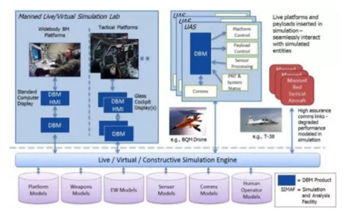 - 2018年1月,DARPA已向BAE系统公司授予DBM项目第三阶段合同,前两阶段发展的成果能让有人/无人机编组在干扰环境中飞行,具备回避威胁和攻击目标的能力。图3是DBM项目的能力验证环境。