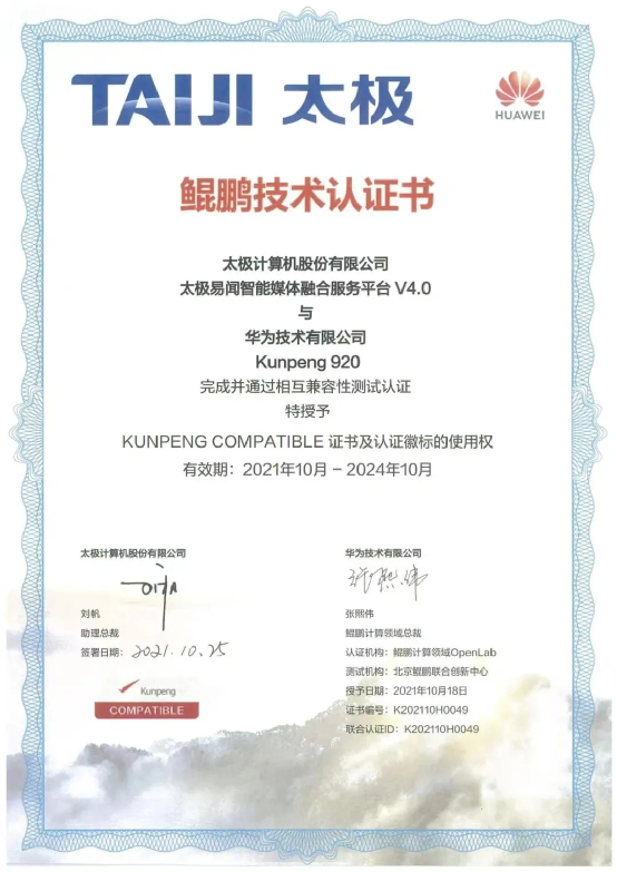 “太极智能媒体融合服务解决方案”已与华为鲲鹏完成兼容性互认证