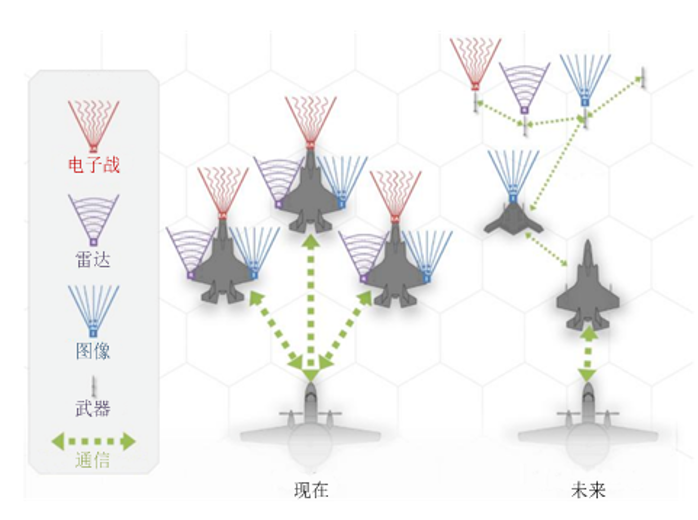 为了探索确保美国空中优势的新方法,2014年,DARPA发布体系集成技术和试验(SoSITE)项目公告。该项目目标是探索一种更新、更灵活的方式,将单个武器系统的能力分散到多个有人与无人平台、武器上,寻求开发并实现用于新技术快速集成的系统架构概念,无需对现有能力、系统或体系进行大规模重新设计。SoSITE项目计划运用开放式系统架构方法,开发可无缝安装、即装即用,并能快速完成现代化升级的、可互换的模块和平台,使得新技术的集成整合更容易、更快速。如图1所示,通过开放式系统架构方法实现空中平台关键功能在各类有人/无人平台间的分配,包括电子战、传感器、武器系统、作战管理、定位导航与授时以及数据/通信链等功能。