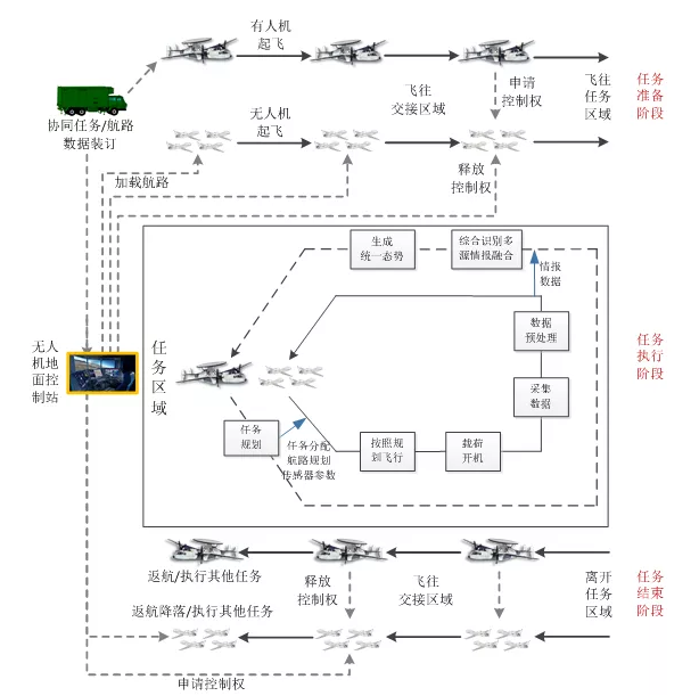 有人机根据当前战场态势信息,分配各个无人机的作战任务,并对无人机的航线和传感器进行规划。无人机在有人机的指挥下,按照规划结果执行飞行任务,抵达目标区域后,传感器开机。有人机上的操作人员对无人机传感器进行控制,无人机负责采集并回传目标情报至有人机。通过多源情报综合处理,形成新的态势信息,为有人机的进一步决策提供依据。